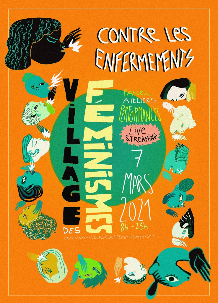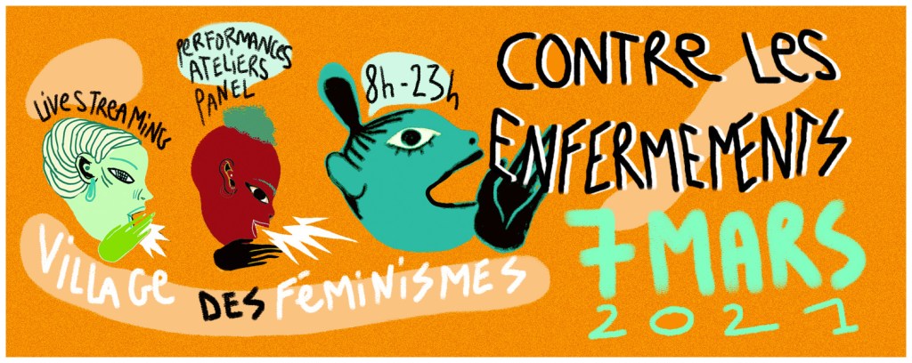 Le 8 mars 2020, pour la journée internationale de lutte pour les droits des femmes, le Village des féminismes #1, et sa cinquantaine de collectifs et associations, accueillait plus d’un millier de personnes pour sortir de l’effroi face à la complaisance du féminisme institutionnel et de la gauche gouvernementale. Cette année, nous ne pouvons que constater les mêmes dynamiques d’instrumentalisation du féminisme par les mêmes institutions et classes dirigeantes. En effet, en refusant d’envisager la nécessité d’une profonde remise en cause du système, les sphères du pouvoir prennent appui sur lui en creusant toujours plus les fossés qui nous isolent à la périphérie, afin de satisfaire leur place de choix au sommet de ce système. Puisque la crise sanitaire actuelle sert de prétexte pour perpétrer et endurcir ces politiques d’isolement, nous en prenons acte en nous positionnant contre les enfermements.